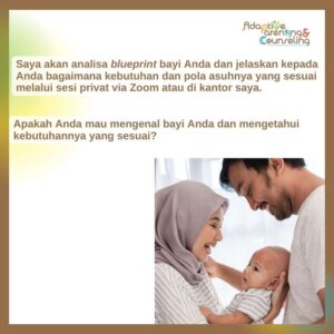 Saya akan analisa blueprint bayi Anda dan jelaskan kepada Anda bagaimana kebutuhan dan pola asuhnya yang sesuai melalui sesi privat via Zoom atau di kantor saya.